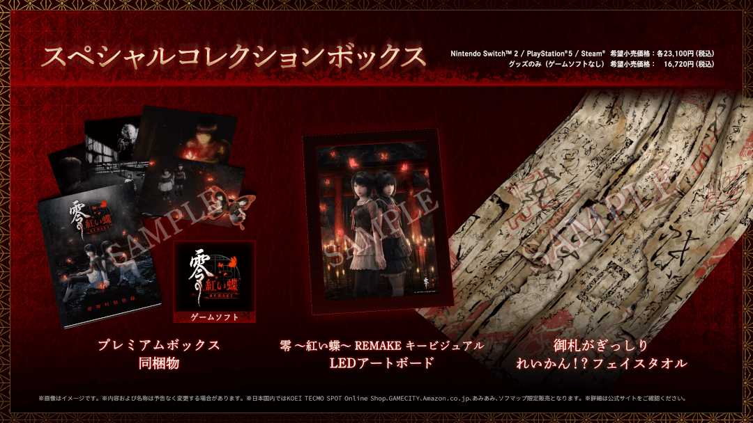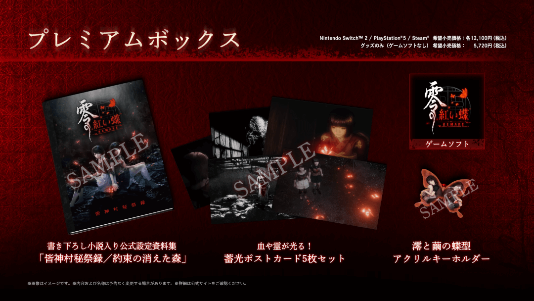| スペシャルコレクションボックス | ・書き下ろし小説入り公式設定資料集 「皆神村秘祭録/約束の消えた森」 ・血や霊が光る!蓄光ポストカード5枚セット ・澪と繭の蝶型アクリルキーホルダー ・零 ~紅い蝶~ REMAKE キービジュアル LEDアートボード ・御札がぎっしり れいかん!?フェイスタオル |