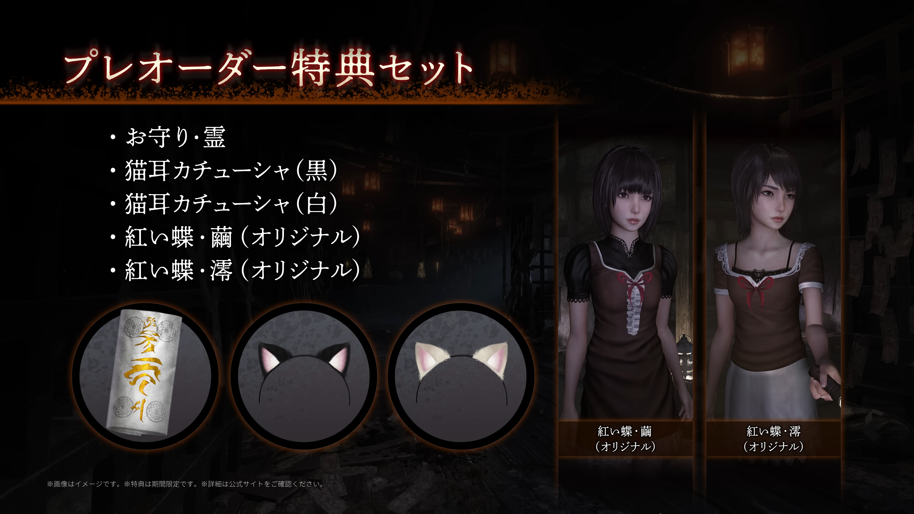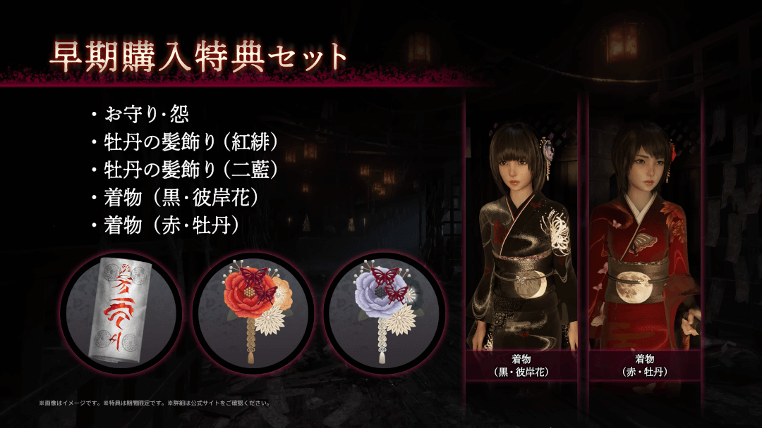 零 紅い蝶(リメイク)を早期購入すると、ゲーム内で使用できる特典が付属する。パッケージ版は初回生産分、ダウンロード版は2026年3月25日までの購入が対象だ。