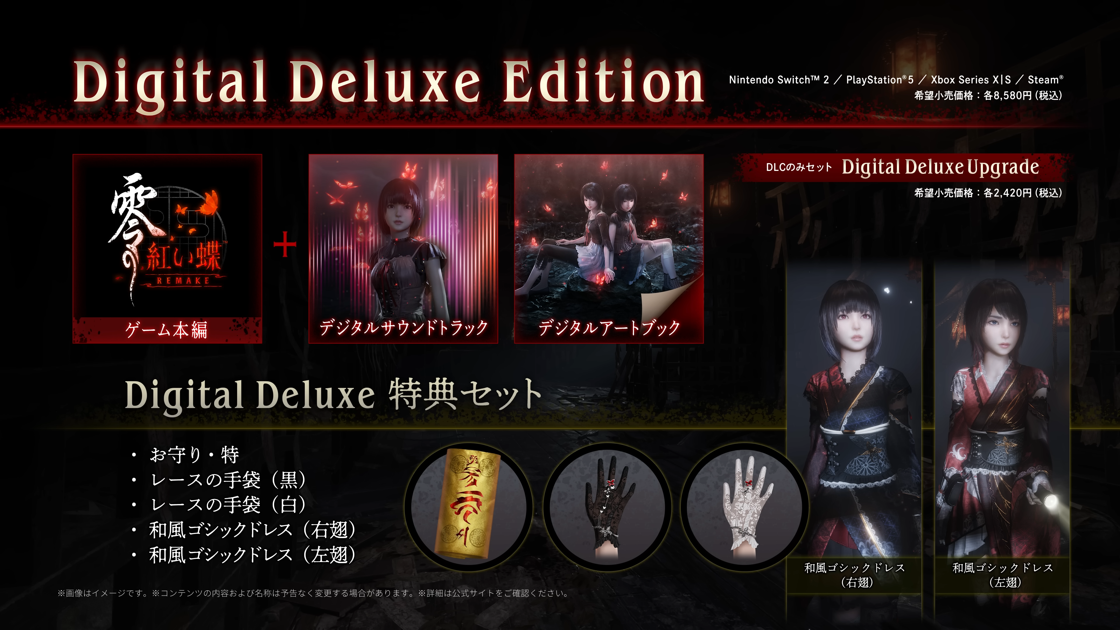 | Digital Deluxe Edition | ・デジタルサウンドトラック ・デジタルアートブック ・お守り・特 ・レースの手袋(黒)※アクセサリー ・レースの手袋(白)※アクセサリー ・和風ゴシックドレス(右翅)※繭限定衣装 ・和風ゴシックドレス(左翅)※澪限定衣装 |