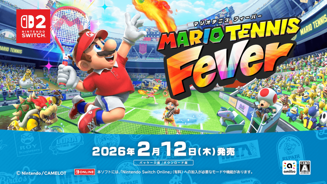 マリオテニス フィーバーの発売日は2026年2月12日である。対応ハードはSwitch2だ。ダウンロード版とパッケージ版が存在する。