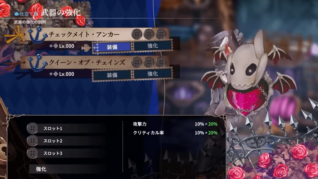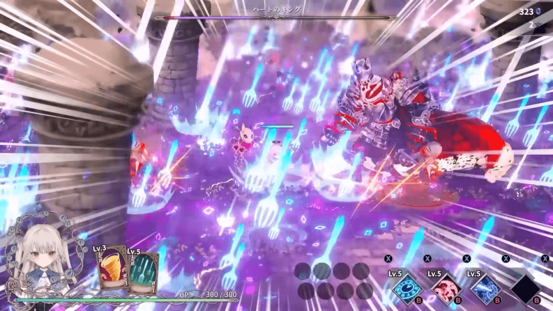 「ティーパーティー会場」では次の戦いに向けて強化をしたり、仲間とお茶をしながらの交流をはかれる。強化の流れとしては、敵を倒して受けた断末魔の浄化をするためアリスが懺悔をしていき、懺悔の際に残る涙を強化アイテムとして、武器やアクセサリーの強化に使う形だ。