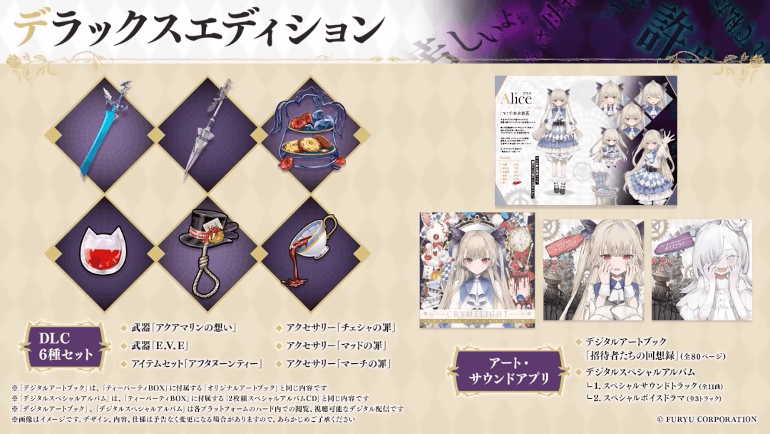 | ティーパーティBOX | ・DLC6種セット ・特典描き下ろしBOX ・オリジナルアートブック ・2枚組スペシャルアルバムCD ・オリジナルデザイントランプ |