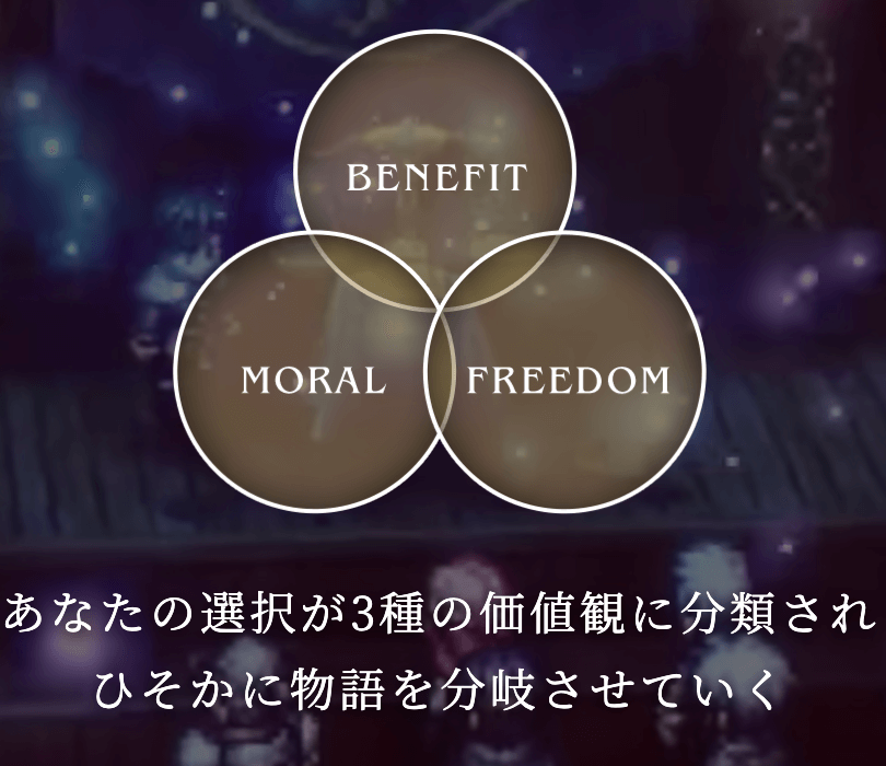 ゲーム中の様々な選択や行動を主人公は取っていく。主人公の言動は、「BENEFIT」「MORAL」「FREEDOM」の3つの価値観に基づいた「信念」に蓄積され、ストーリーを分岐させる。ストーリー分岐は仲間ユニットの離脱と加入にも影響を与えるぞ。