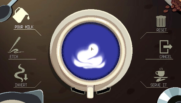 飲み物の作成が重要となる本作は、ラテアートで自分なりのオリジナルデザインを作れる。前作から引き続きプレイ出来るラテアート機能は、お客に提供するコーヒーにミルクを使って自由にデザイン可能。お客が喜ぶ最高のラテアートを作ってみよう。