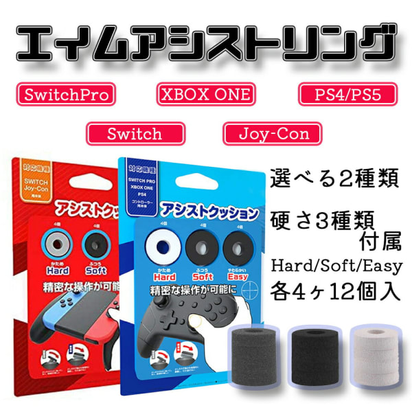 PS4やPS5、Xboxはもちろん、SCUF(スカフ)製コントローラーにも対応したエイムリングです。ソフト・ミディアム・ハードの3種類から硬さを選べ、それぞれ2個ずつリングが同梱されています。弾力性の高い合成樹脂素材により、ゲーム内感度が高くてもエイムを制御しやすいのが特徴です。
