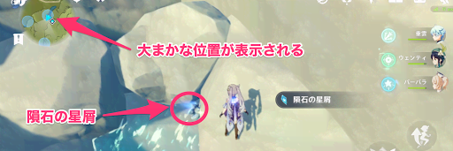 キャラクターが隕石の星屑に近づくと、キャラクターが身につけている神の目が光を放つ。キャラクターによって神の目の場所は違うので、背中側に神の目がついているキャラで探索しよう。また、ウェンティは隕石に近付いても神の目が反応しないので注意だ。
