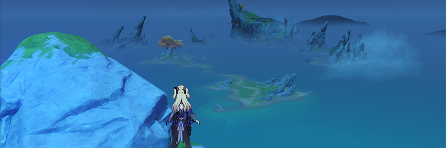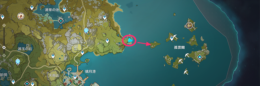 孤雲閣は、璃月港北東の崖から飛んで行ける。孤雲閣の島々は砂浜でつながっているので、歩いて探索可能だ。