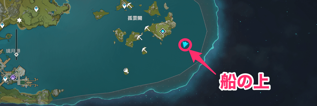 孤雲の艦船は、孤雲閣の南東にある船「南十字・死兆星」に乗ると自動で発生する。滑翔か神里綾華やガイアの氷元素スキルを使って船まで行き乗り込もう。