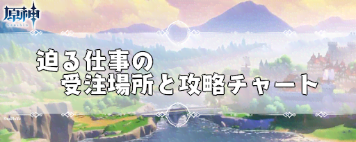 原神(げんしん)における世界任務「迫る仕事」の攻略方法を掲載。受注の条件や場所、報酬をはじめ、攻略手順について解説しているため、原神(げんしん)を攻略する際の参考にどうぞ!