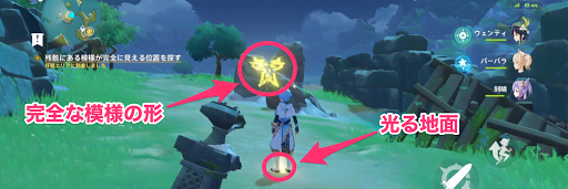 地中の塩に着いたら、遺跡の封印を解くために2つの装置を解除しよう。1つ目は光る地面の場所から模様が完全に見えるように視点を変えると解除でき、2つ目は南、東、西、北の順番に雷元素で明かりを灯すと解除できる。また、任務一覧画面でヒントを確認できるため詰まったら見てみよう。