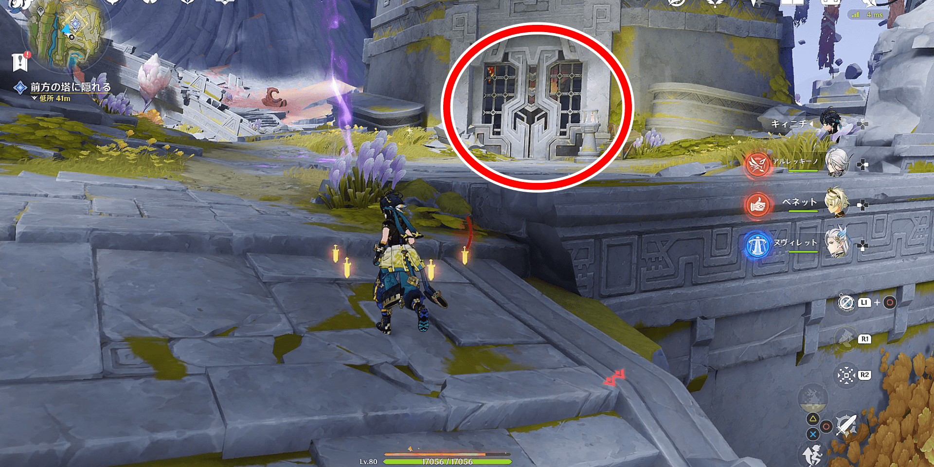 手順2の位置から階段を上に登った先