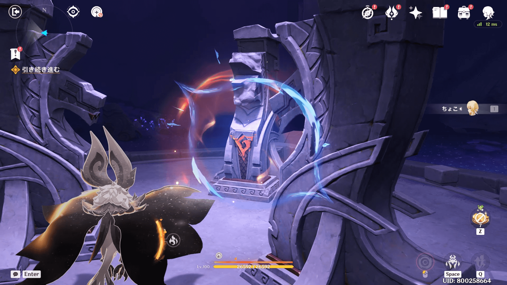 途中でトーテムが出現したら、炎元素攻撃を当てよう。主人公の元素スキル後通常攻撃で、炎の斬撃を飛ばすのが楽。