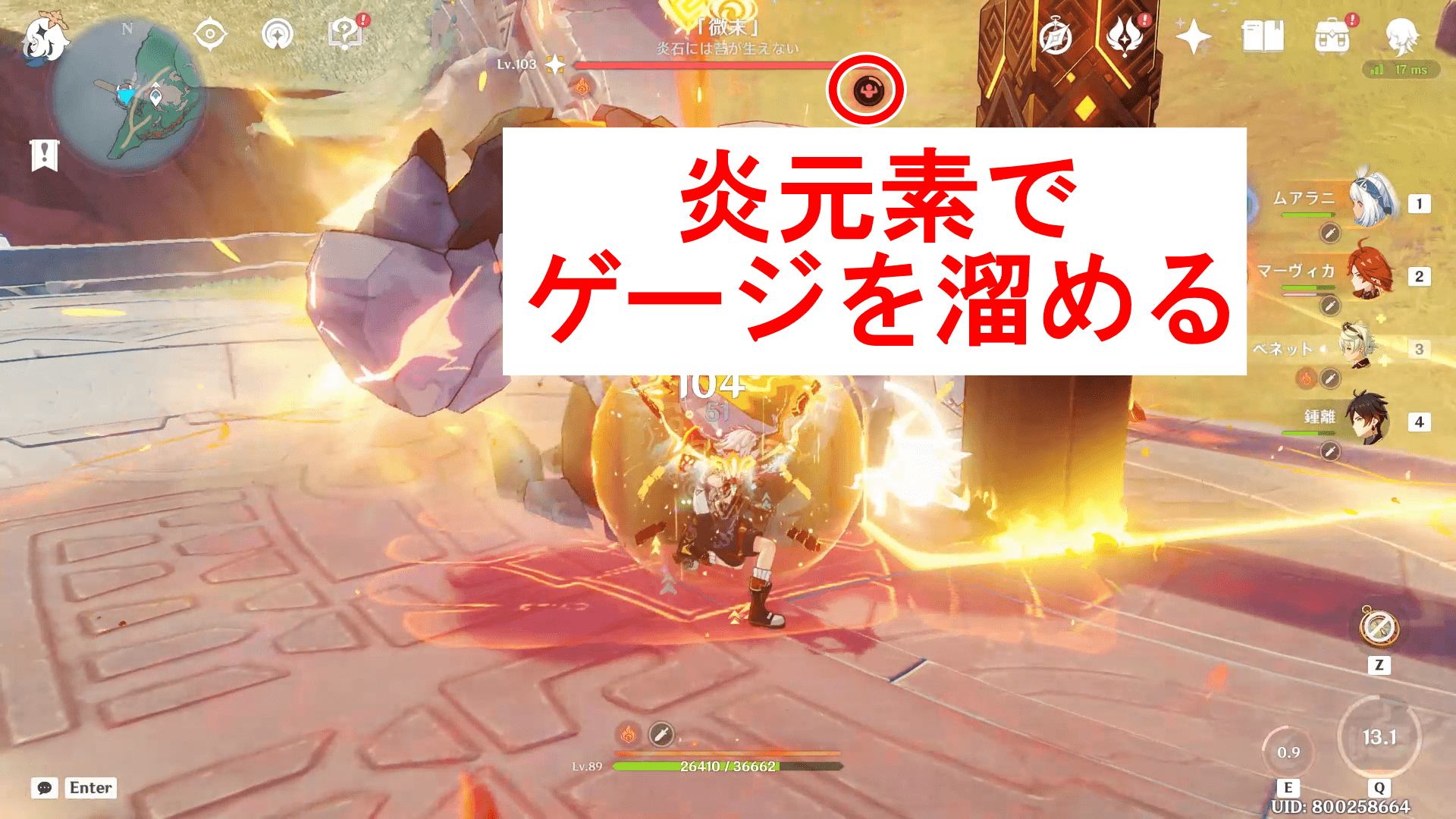 岩元素バリアを破壊したら、炎元素攻撃でゲージを溜めよう。炎元素を付着し続けゲージを最大まで蓄積させると、敵の耐性が大きくダウンしダメージが通るようになる。ゲージ蓄積から30秒経過で再び岩元素バリアを展開するため、耐性が下がってる間に集中攻撃して倒し切ろう。