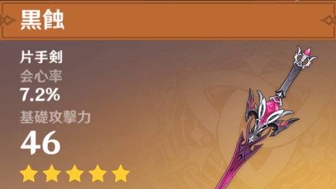 黒蝕は、元素爆発のダメージを上げられる片手剣だ。無条件で元素爆発の会心ダメージアップを得られるうえ、爆発命中時には、自身と味方の攻撃力を上げられる。待機中でも効果が発動するため、元素爆発主体のサブアタッカーと特に相性が良い。