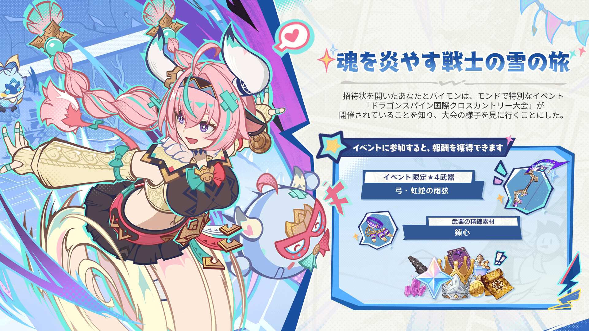 虹蛇の雨弦は、期間限定イベント「魂を炎やす戦士の雪の旅」で手に入る。星4武器が無料で手に入るため、期間中はイベントを優先して攻略しよう。