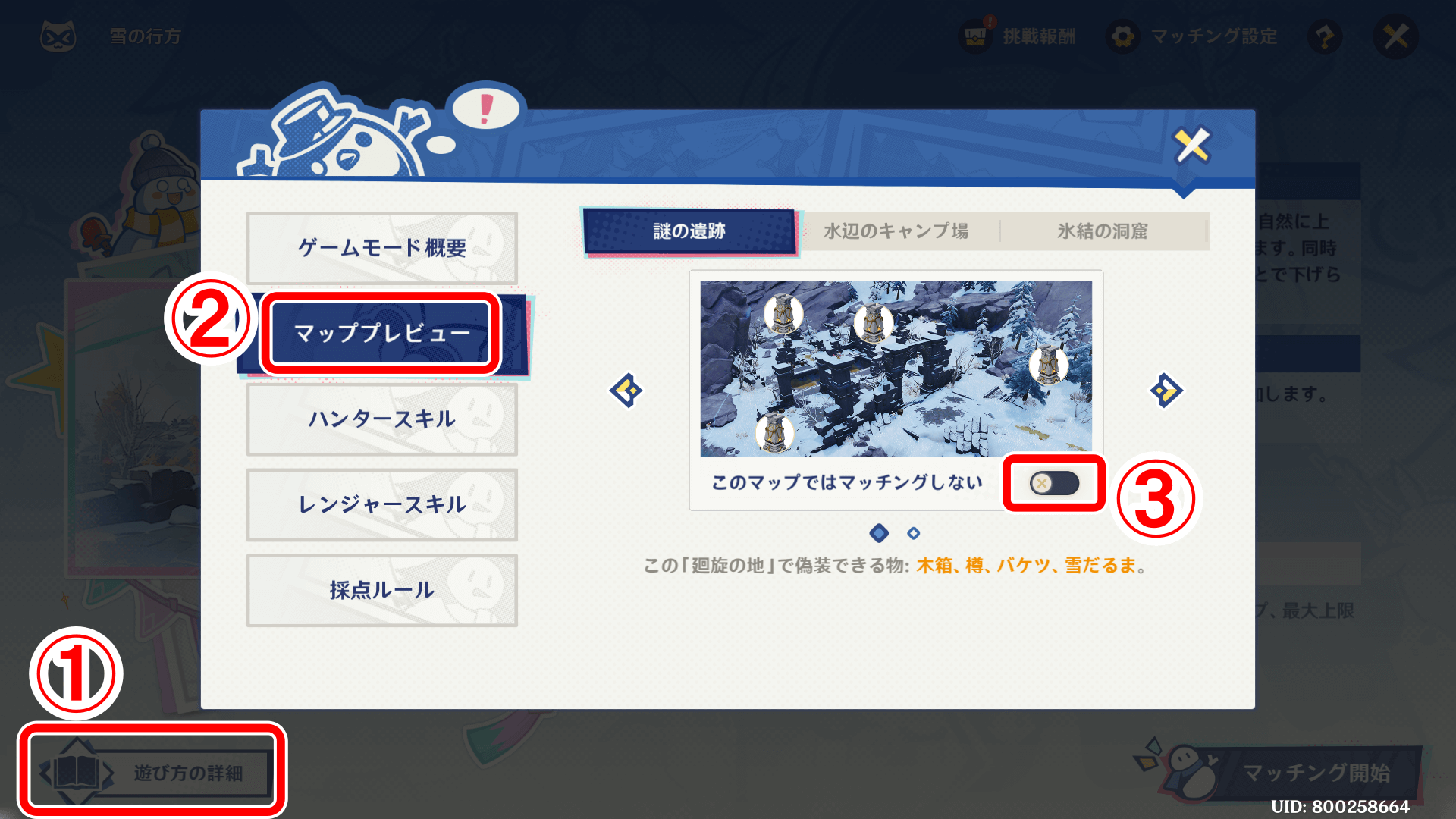 雪の行方はランダムでマップが選択されるが、遊びたくないマップはあらかじめマッチングしないように設定も可能だ。苦手なマップがある場合は設定しておくのがおすすめ。