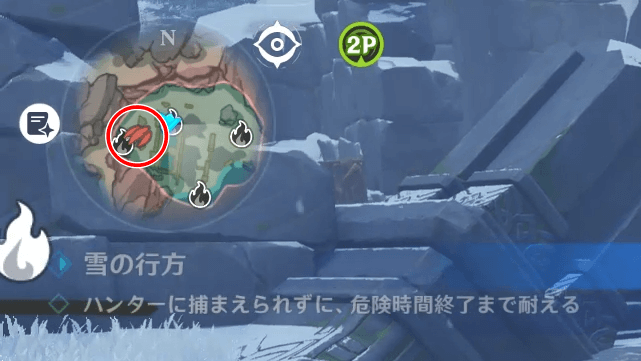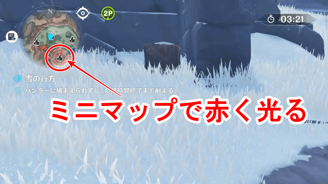 ミニマップにはハンターの位置が表示されるため、常に確認しておこう。なお、吹雪中のみハンターの表記が消える。