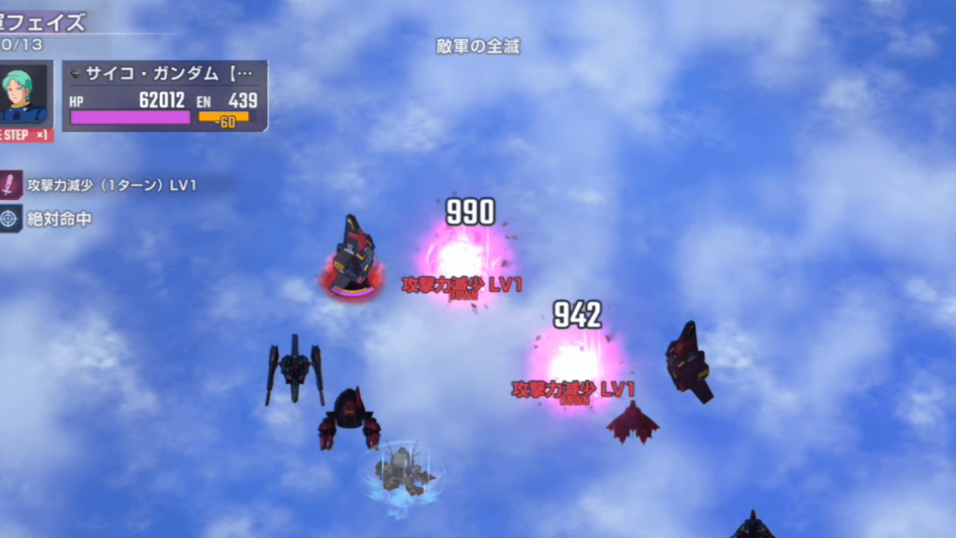 シークレット部隊のサイコ・ガンダムは、マップ兵器で範囲攻撃をしてくる。残りHPが低いユニットがいるときは、巻き込まれないように遠くに避難させるのがおすすめ。また、マップ兵器は攻撃力ダウンを付与するため、デバフを受けたら支援攻撃を活用しながら敵を撃破しよう。