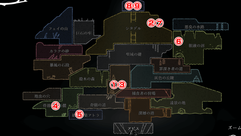| 6 | 胆液の沼のボスを倒した先の建物内で「求者の魂」を入手 |