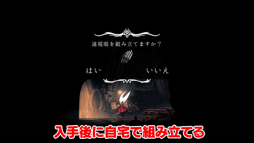 鐘の家の机では、第3章のアビスで入手できる「遠視眼」を組み立てられる。遠視眼は達成率を確認できるようになるアイテムなので、達成率100%を目指す場合は必ず入手しておこう。