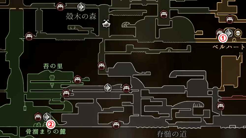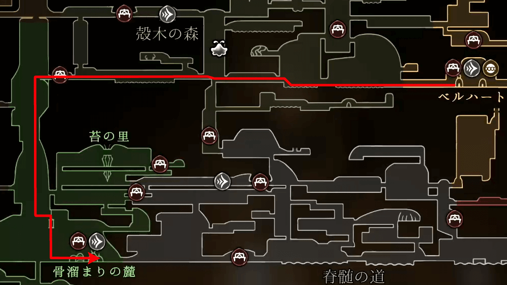 骨溜まりの物資を運ぶ際は、殻木の森を抜けるルートがおすすめ。道中には面倒な敵と遭遇する場所もないため、安全に運びやすいルートだ。