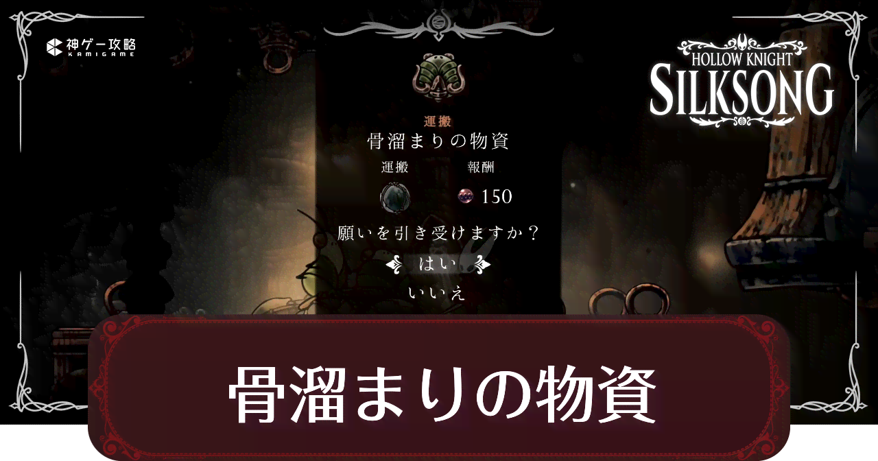 ホロウナイトシルクソングのサブクエスト「骨溜まりの物資」を解説。シルクソングのタスク骨溜まりの物資のおすすめルートや発生場所、発生条件に加え、骨溜まりの物資クリア時の報酬を掲載しています。