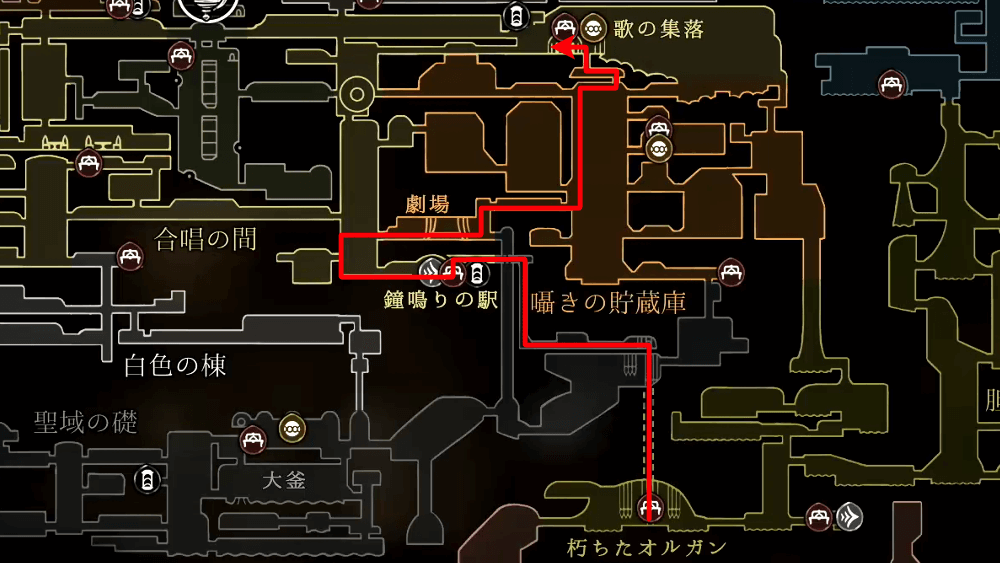 歌の集落の物資を運ぶルートは、罪深き者の道や朽ちたオルガンを抜けるルートがおすすめ。暴風の石段からシタデルに向かうルートよりも距離が短いため、安全に運びやすい。また、先に道中の面倒な敵を倒しておけば、より安全に運ぶことも可能だ。