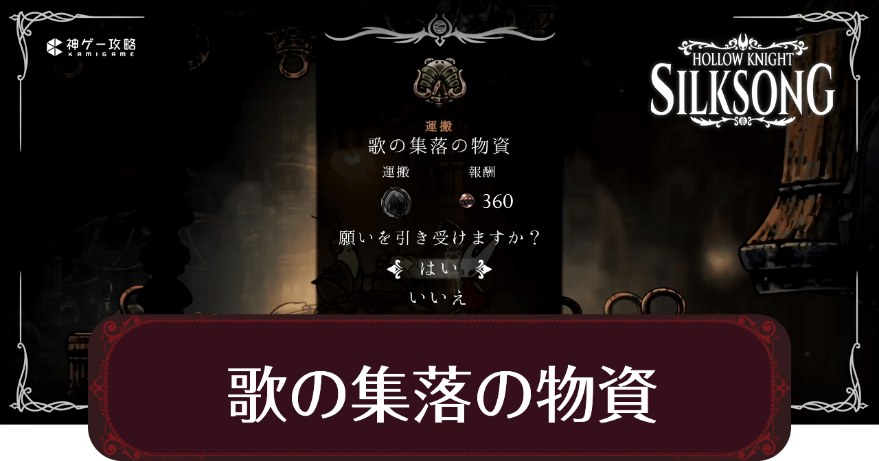 ホロウナイトシルクソングのサブクエスト「歌の集落の物資」を解説。シルクソングのタスク歌の集落の物資のおすすめルートや発生場所、発生条件に加え、歌の集落の物資クリア時の報酬を掲載しています。