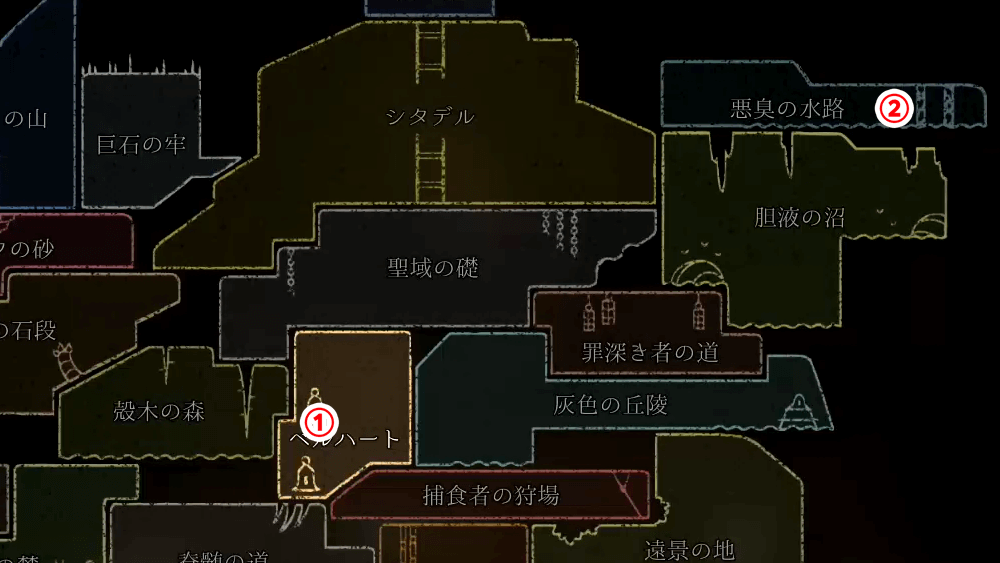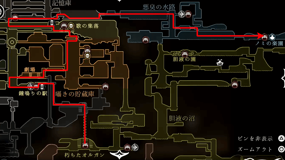 ノミの楽園の物資を運ぶルートは、歌の集落を経由して悪臭の水路に向かうルートがおすすめ。面倒な敵が多く道中の難易度も高い胆液の沼を避け、安全に運びやすい。また、先に悪臭の水路の敵を倒しておけば、より安全に運ぶことも可能だ。