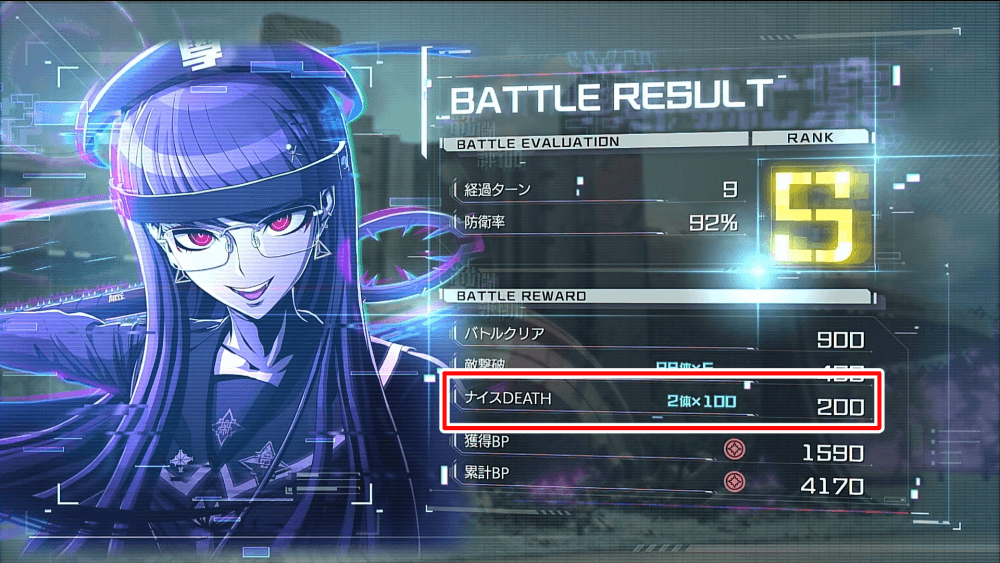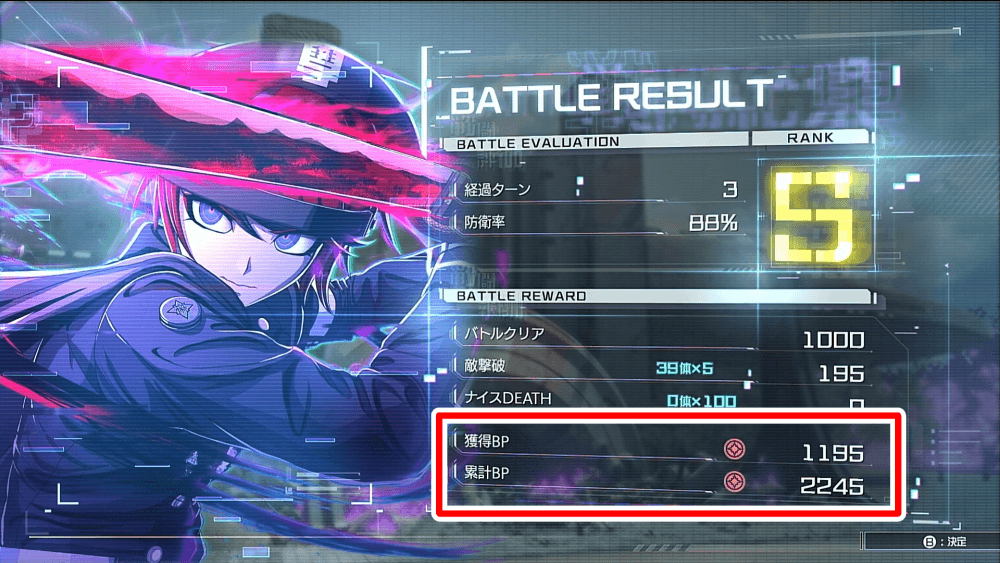 BPはVR訓練や探索、ストーリーの戦闘などで入手可能だ。戦闘でのBP獲得は、基本報酬に加えて、敵撃破数やナイスDEATHなどで追加入手できるため、なるべく多くのBPを受け取れるように戦闘を行おう。