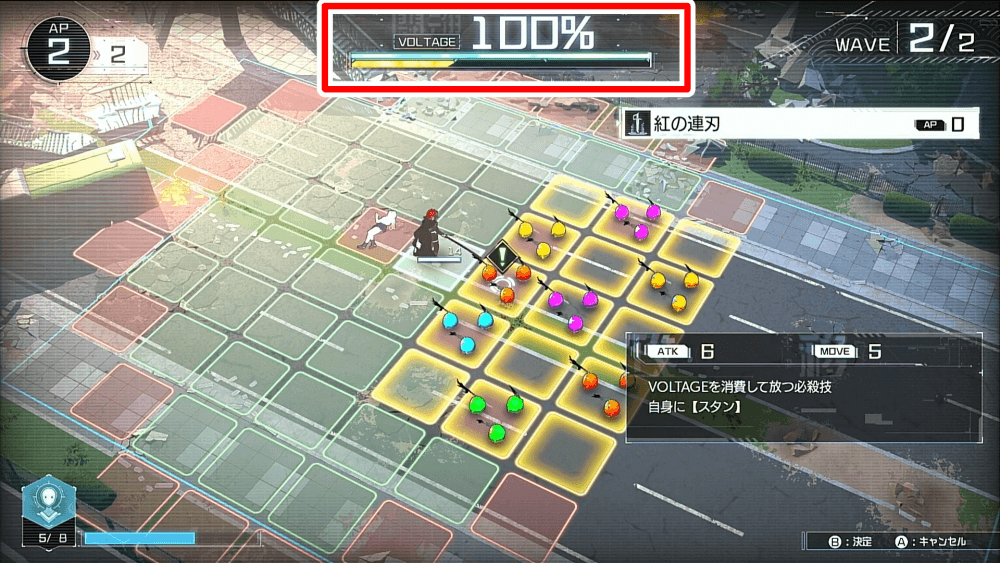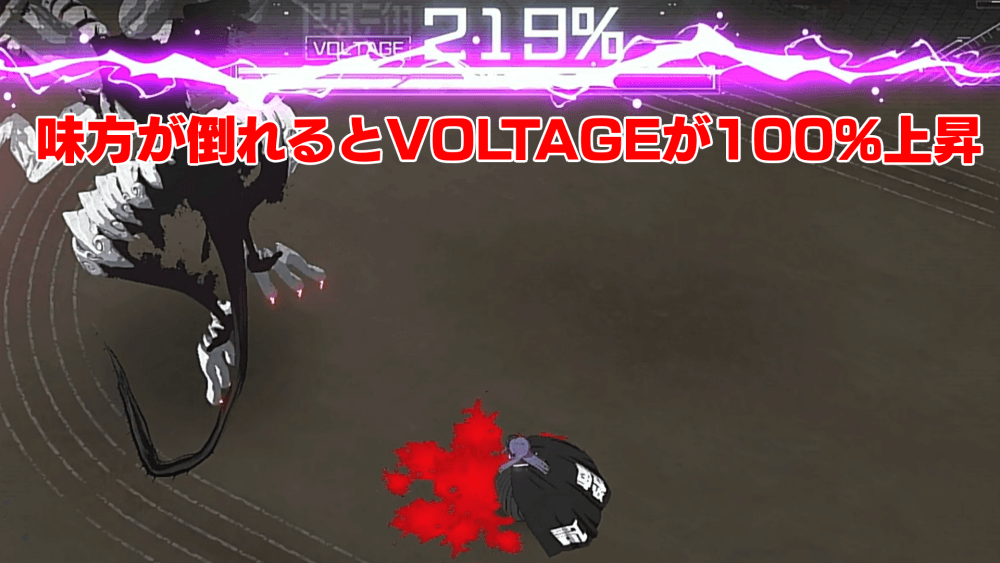味方が戦闘不能になると、必殺技の使用に必要な「VOLTAGE」が100%溜まる。必殺技は広範囲かつ高威力のものが多く、戦況を一気に変えられるので、敢えて1人のキャラで攻撃を受けて必殺技の発動を狙うのも有効だ。