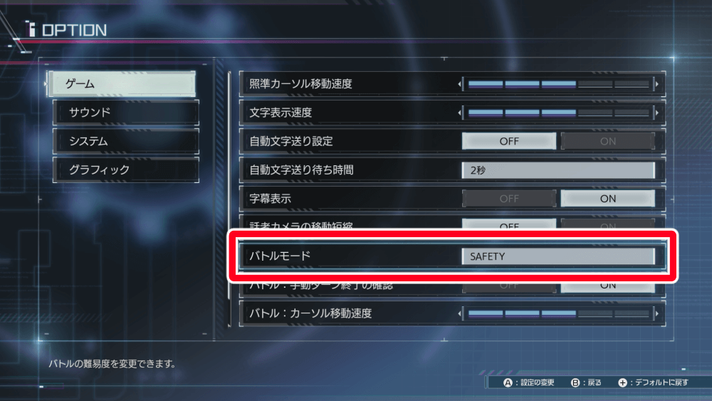 難易度「SAFETY」は、バトル中に敵のターンが終了する度に全味方キャラのHPを状態異常が全回復するようになる。ただし、1ターン以内に倒されてしまった味方は復活しない点には注意しよう。バトルで倒されにくい難易度となるため、ストーリーを重視して見たい人におすすめの難易度だ。