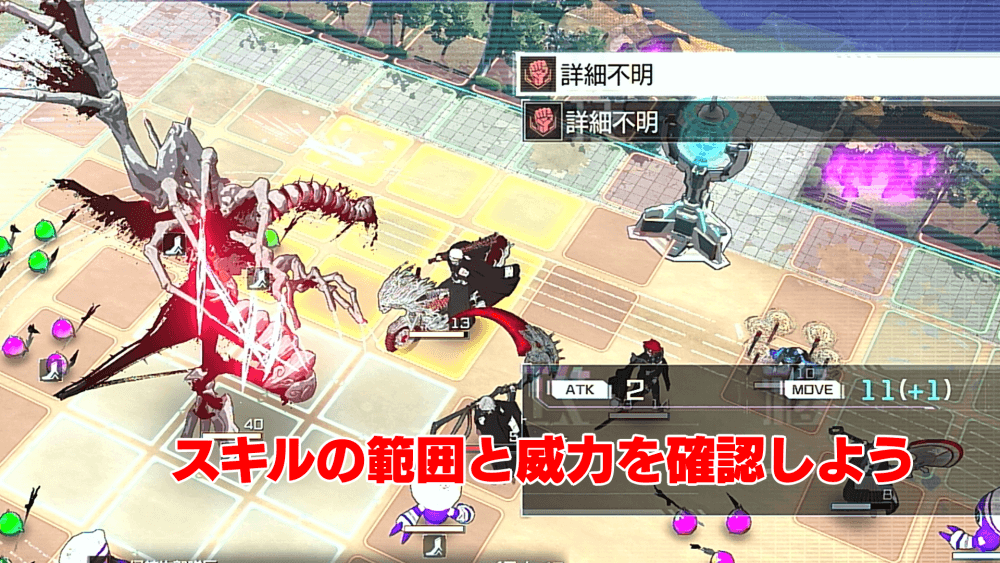 ボスに勝てない時は、ボスのスキルと行動パターンを確認しよう。ボスは通常の敵とは異なり、広い攻撃範囲と特殊なスキルを持っている。行動を把握するだけでも、仲間をまとめて攻撃されたり、大ダメージを受けるのを避けれる場合があるため、ボス戦では敵の詳細を見る癖をつけよう。