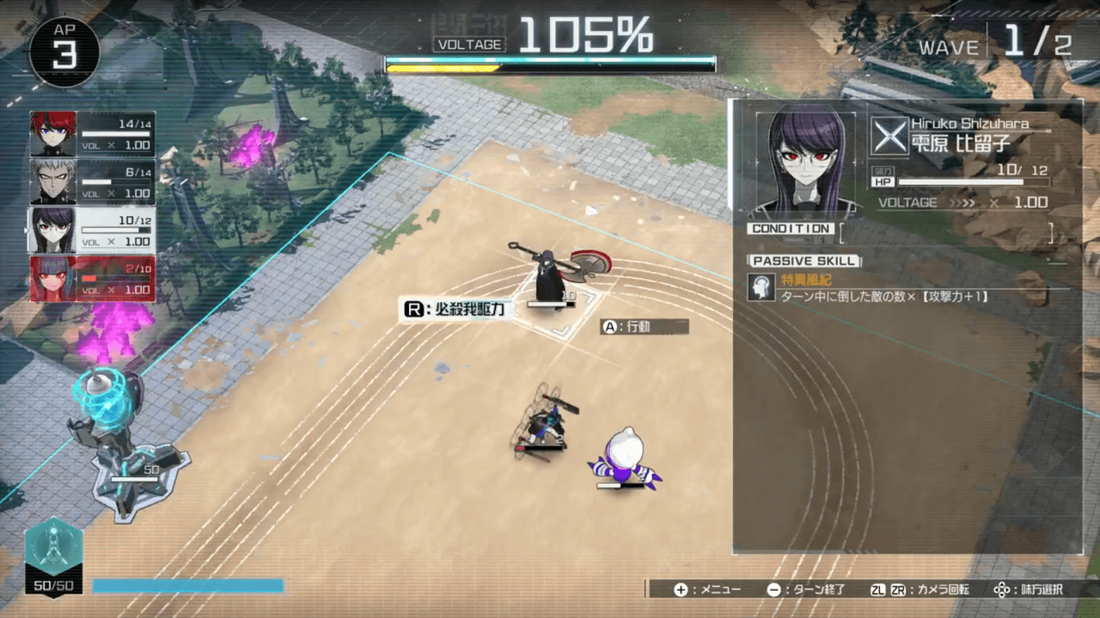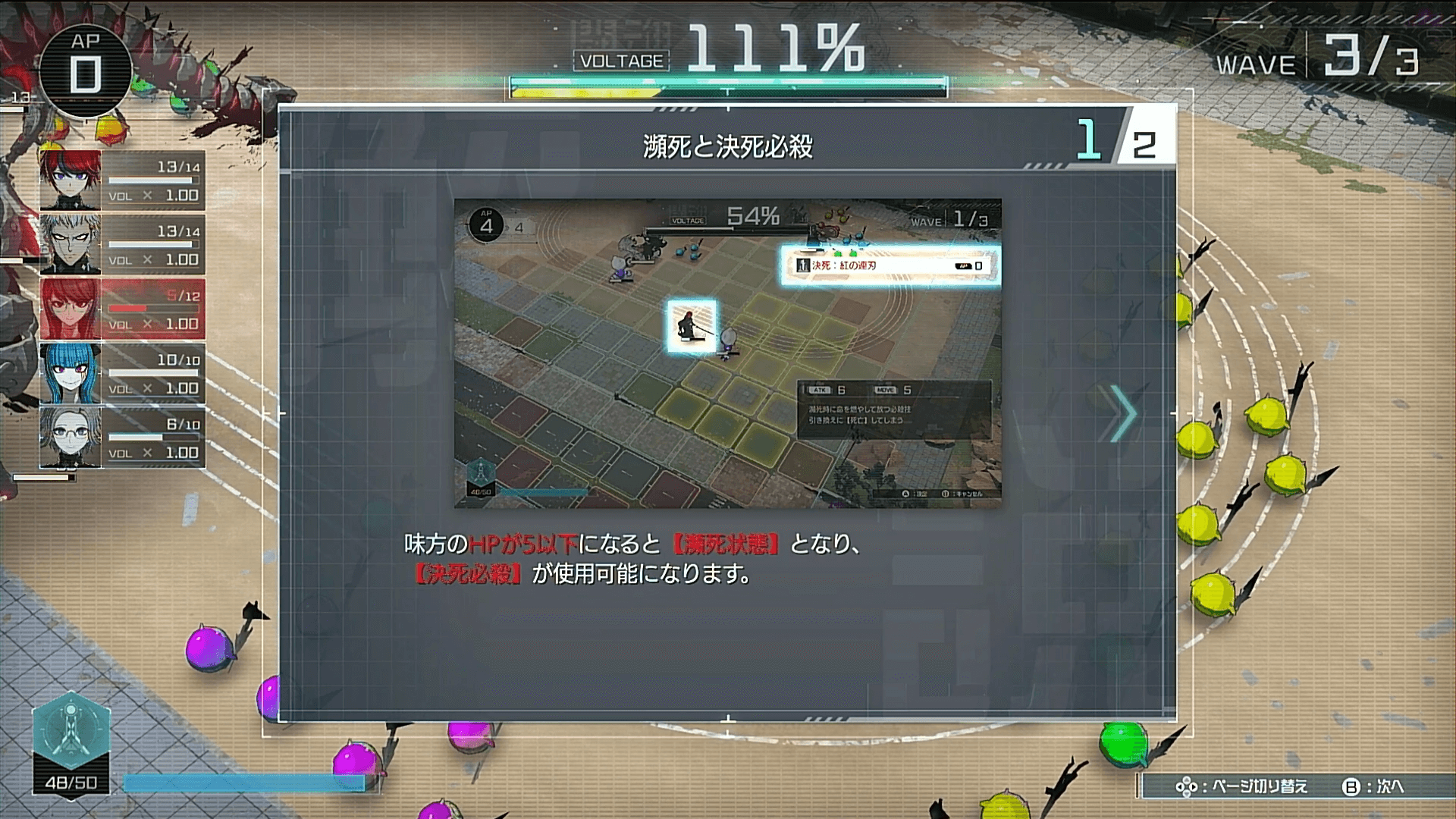 必殺技は、VOLTAGEが100%以上になっていると出せる。各キャラごとに性能や範囲が異なるので、状況に応じて誰が動くか決めよう。