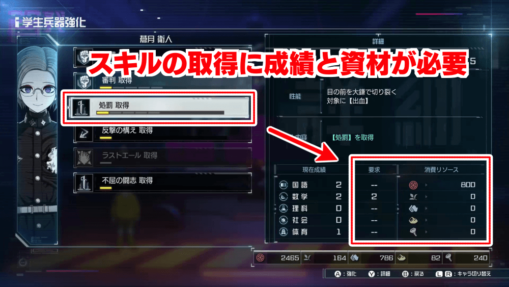 成績は、スキルレベルの上昇に必要な要素の1つ。スキルレベル上げには、BPと成績、資源が必要。BPはVR訓練、成績は学究活動、資源は探索でそれぞれ集めよう。
