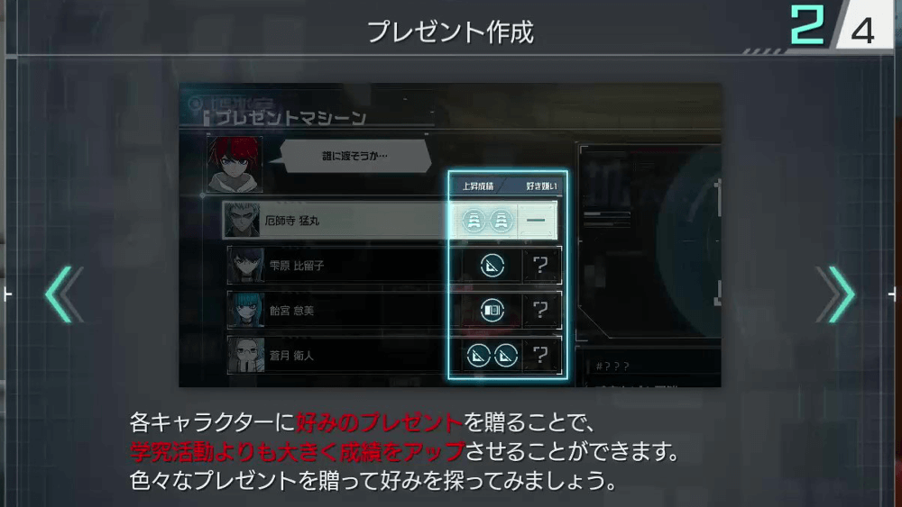 10日目になると娯楽室とリラックスルームが解放され、娯楽室ではプレゼント作成が可能になる。学究活動よりも大きく成績をアップさせられるため、10日目以降で成績を上げたい時はプレゼントを作成しよう。