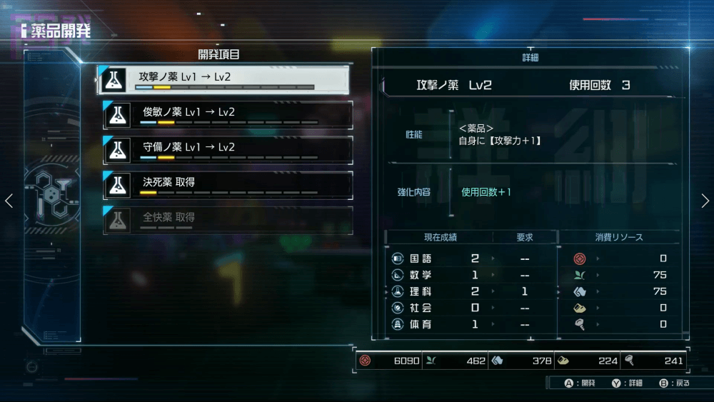 30日目に工作技術室と生物薬品室が解放され、戦略物資の強化が可能になる。薬品には「理科」、防壁装置には「社会」の成績が主に要求されるため、川奈(理科)や丸子(社会)にプレゼントを渡して成績を上げよう。