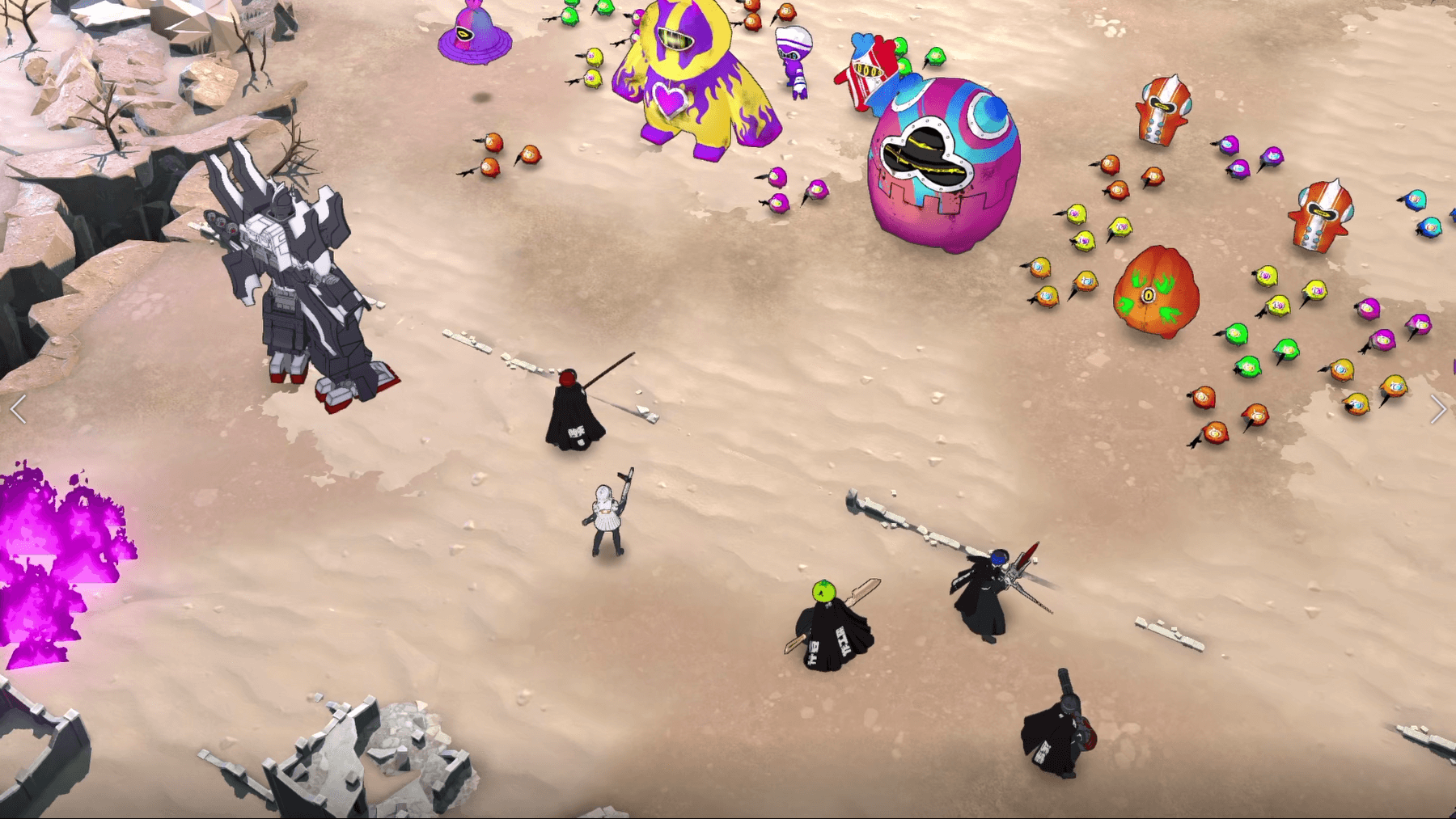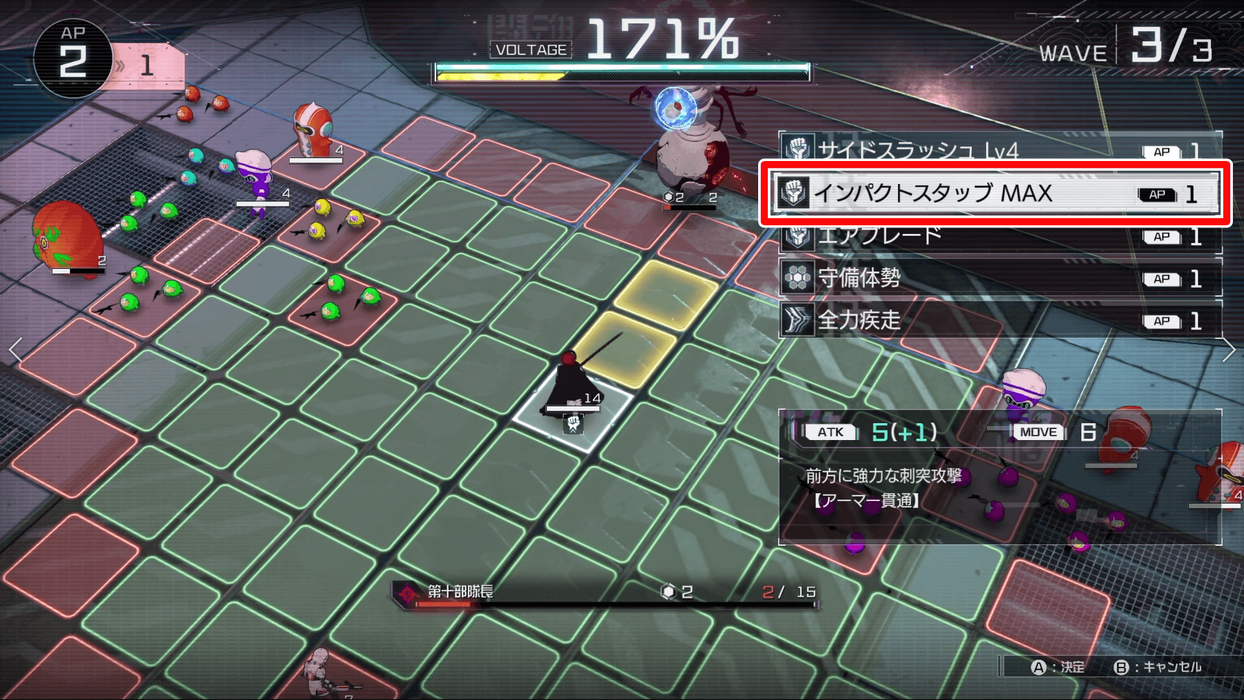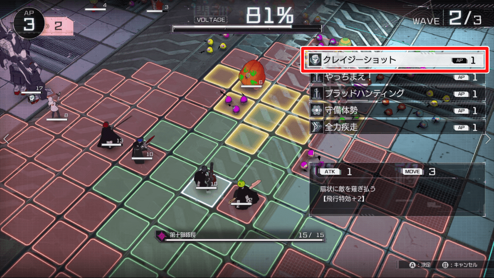 WAVE3でも、序盤は丸子の「クレイジーショット」で掃討するのがおすすめ。ボスがアーマーを張ってくるため、主人公の「インパクトスタッブ」でアーマー貫通攻撃をすると良い。