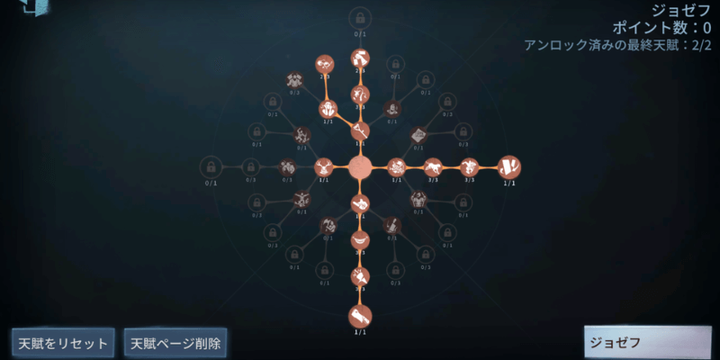 | 写真世界 | カメラを使って撮影し、この時刻のサバイバーとフィールドを複製し、静止した写真世界を創り出す。ジョゼフはいつでも写真世界に入り、過去のサバイバーを探してロケットチェアに拘束することができる。サバイバーはカメラの残留映像を通って写真の世界に入ることができる。写真世界は静止しているため、サバイバーは荘園から脱出することも、ロケットチェアで荘園に送り返されることもない。写真世界で暗号機解読の進度を累積できるが、解読の完了はできない。写真の中の人物も、写真世界に入ったサバイバーにステータスアップまたはステータスダウンの全体効果を及ぼすことができない。 【特殊】 写真世界が崩壊したあと、カメラはしばらくのクールタイムが必要になり、その後再び撮影が可能になる。同時に、写真世界で累加された状態の半分は、現実世界に投影される。これによって与えられるダメージは防げない。 |