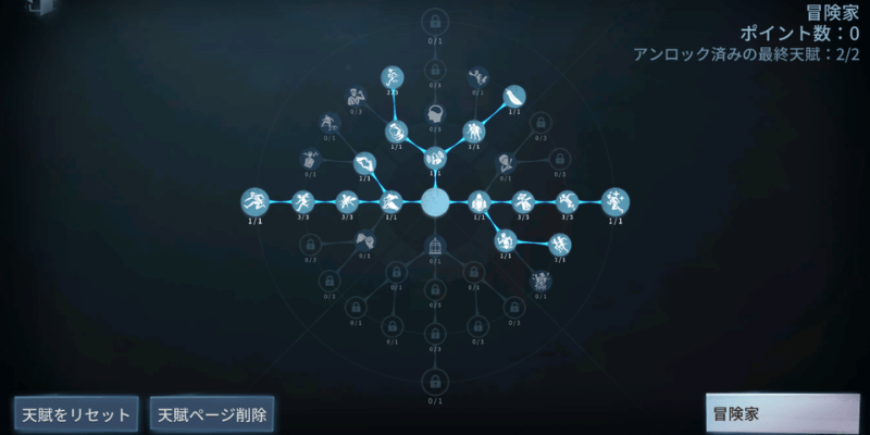| 探検 | 高レベルのサバイバルスキルを持ち、痕跡を隠す方法を知っている。足跡の持続時間が1秒減少し、板・窓を乗り越えてもハンターに特効の表示がされない。 |