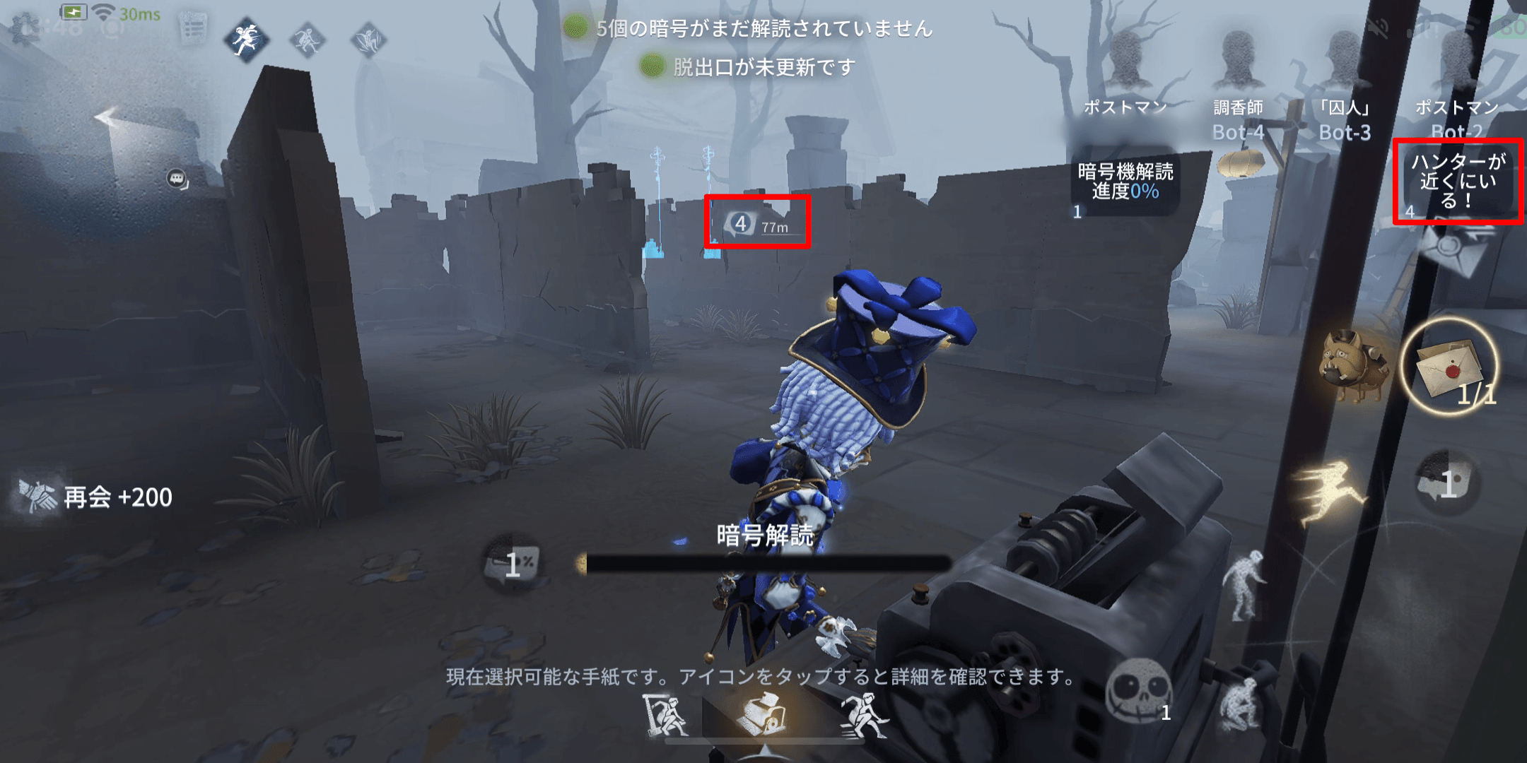 解読中は味方に手紙を送信してバフを付与させよう。解読中の味方がいる場合は「解読中の味方に冷静の手紙」、救助狩りされる危険性がある場合は「救助へ向かう味方に勇敢の手紙」、通電が近い時は「脱出ゲートの解読や通電直前に救助へ向かう味方に希望の手紙」を送信するのがおすすめだ。