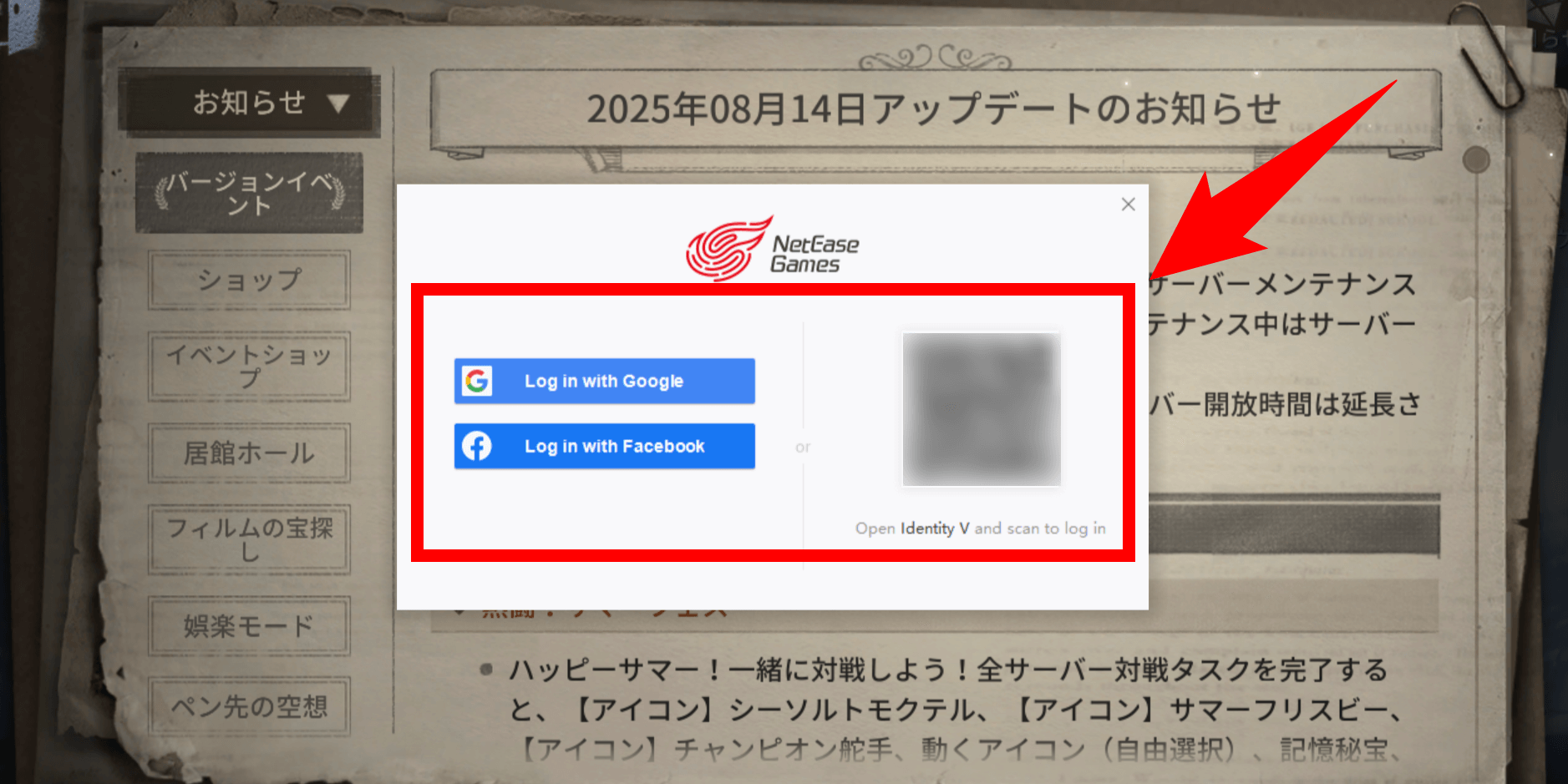 ログインしていない状態でPC版第五人格を起動すると、ログイン画面が表示される。ログイン方法はGoogleアカウント/Facebookアカウント/QRコード撮影の3種類だ。