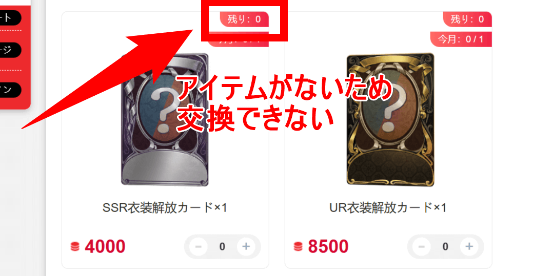 欲しいアイテムを押下し、交換したい個数を選択して「今すぐ交換」をタップしよう。各アイテムは毎月の交換個数に上限があり、上限を超える数は選択できない。
