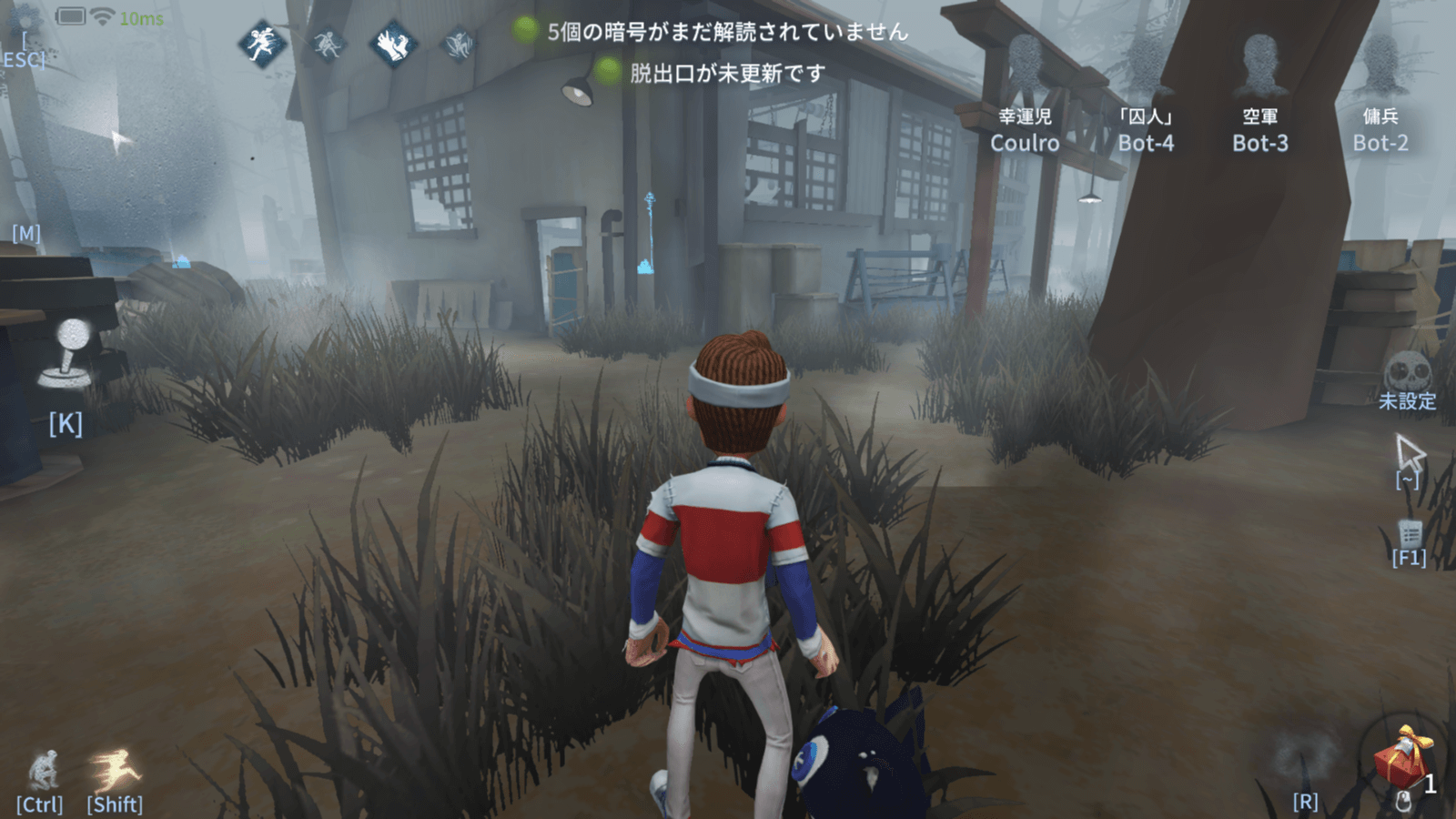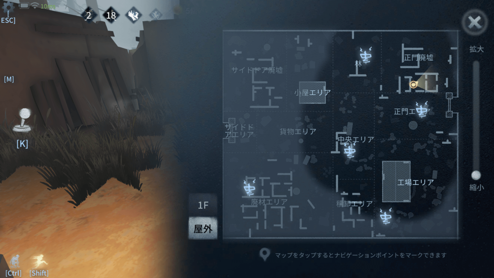 廃墟内部の高い壁があるエリアは、板や窓が配置されておりチェイスに使えるポジションだ。廃墟内で時間を稼いだら、板を経由しつつ小屋か工場まで逃げ込むと良い。