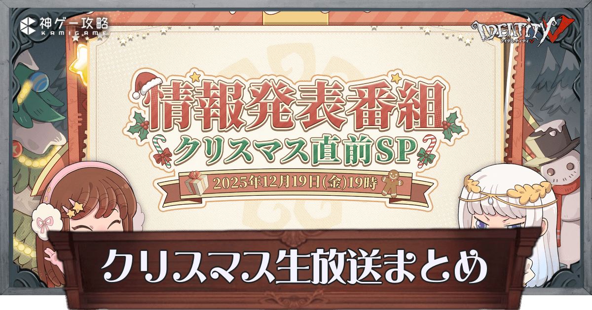 第五人格(IdentityV)において、12月19日に公式が配信したクリスマス直前SP生放送の内容をまとめている。変更点や今後開催されるイベントの詳細についても掲載しているので、生放送の最新情報が知りたい方は是非参考にどうぞ!