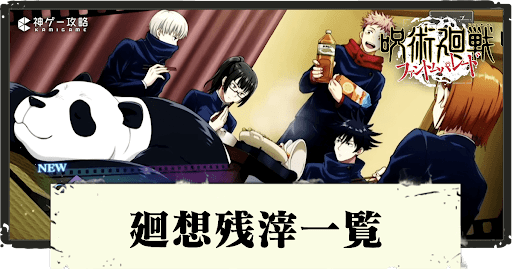 呪術廻戦ファントムパレード(ファンパレ)の廻想残滓を紹介。廻想残滓(かいそうざんし)の効果や使い方をはじめ、レアリティやクールタイムなども一覧形式で掲載しているので参考にどうぞ。
