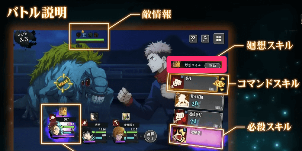 | 戦闘中に任意のタイミングで発動可能攻撃性能アップや呪力回復など効果は様々 |