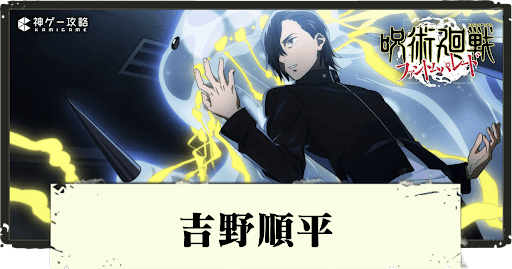 呪術廻戦ファントムパレード(ファンパレ)の「吉野順平SR[命の価値]」を紹介。吉野順平の性能評価やおすすめ廻想残滓とパーティー編成に加え、覚醒(凸)効果やステータスとスキル、必殺技の効果と育成素材も掲載しているので参考にどうぞ。