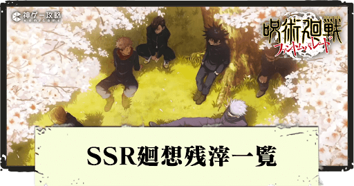 呪術廻戦ファントムパレード(ファンパレ)のSSR廻想残滓を紹介。SSR廻想残滓の一覧と簡易評価、ユーザー評価も載せているので掲載しているので参考にどうぞ。