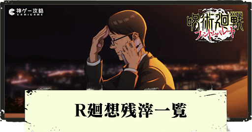 呪術廻戦ファントムパレード(ファンパレ)のR廻想残滓を紹介。R廻想残滓の一覧と簡易評価、ユーザー評価も載せているので掲載しているので参考にどうぞ。
